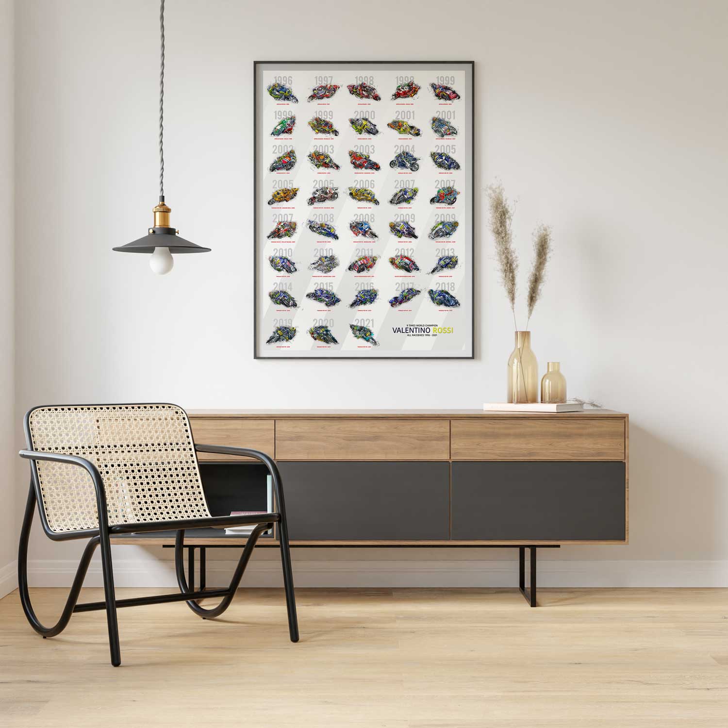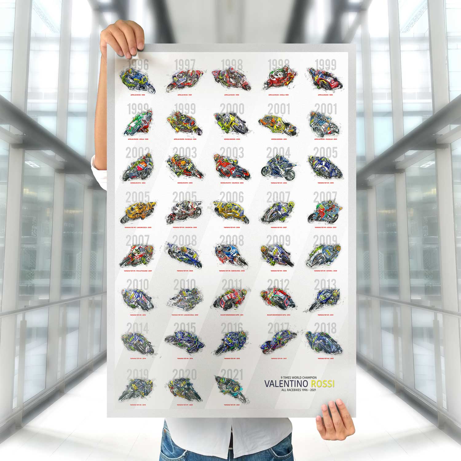 Valentino Rossi Poster – Alle Motorräder seiner legendären MotoGP-Karriere